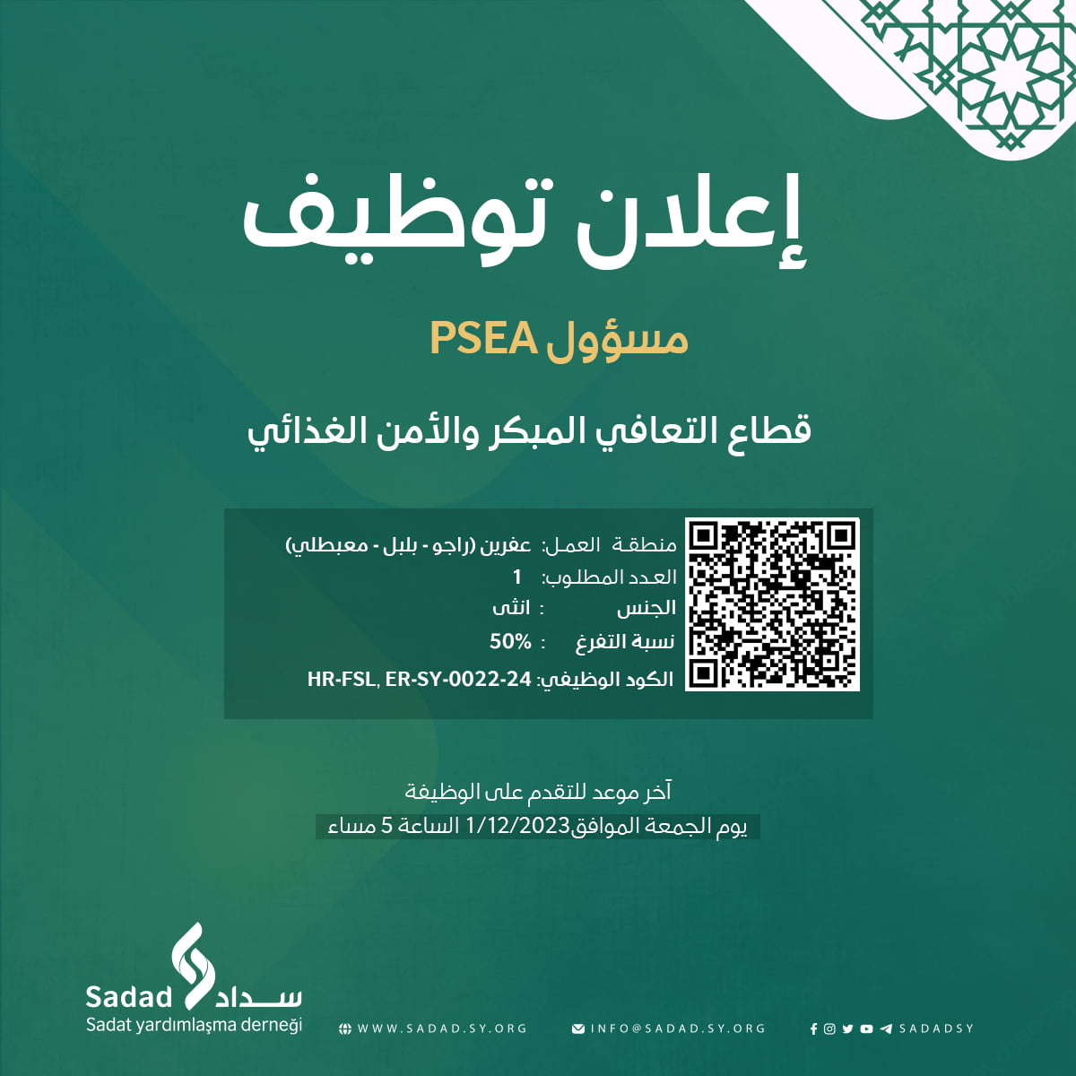 تدعوكم منظمة سداد الإنسانية للتقدم إلى شاغر مسؤولةPsea ضمن قطاع التعافي المبكر والأمن الغذائي المنصب: مسؤولة Psea التفرغ : 50%