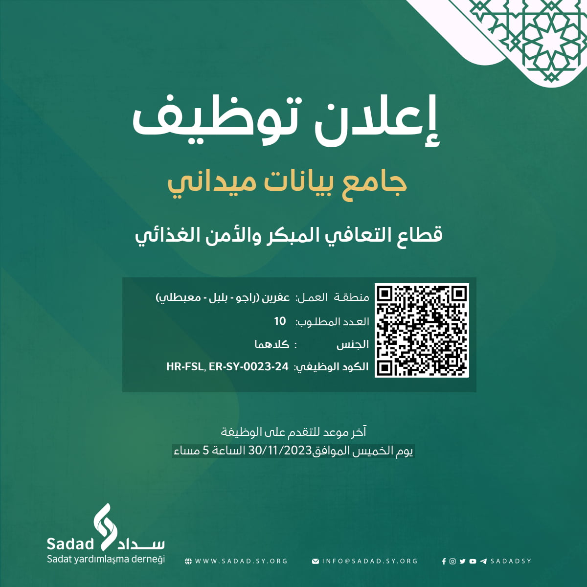 تدعوكم منظمة سداد الإنسانية للتقدم إلى شاغر جامع بيانات ميداني ضمن قطاع التعافي المبكر والأمن الغذائي المنصب: جامع بيانات