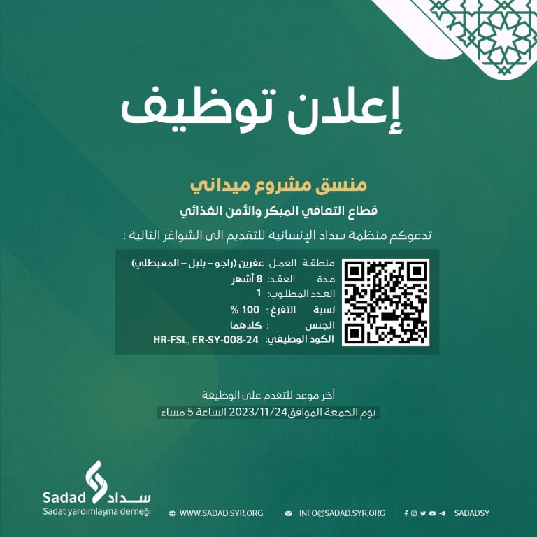 تدعوكم منظمة سداد الإنسانية للتقدم إلى شاغر بصفة منسق مشروع ميداني ضمن قطاع التعافي المبكر والأمن الغذائي المنصب: منسق مشروع