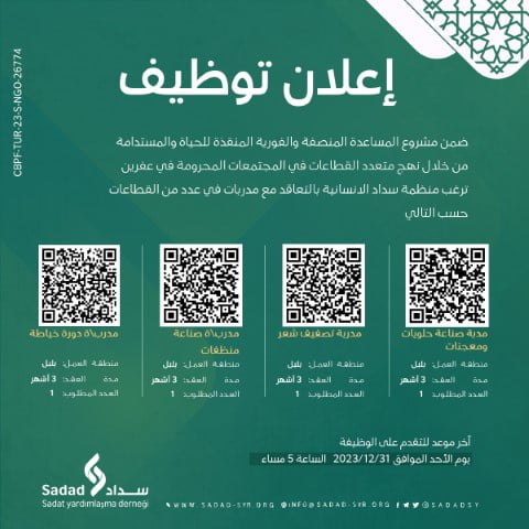 تدعوكم منظمة سداد الإنسانية للتقدم إلى الشواغر التالية : منطقة العمل :عفرين (بلبل ) مدة العمل: 3أشهر - مدربة صناعة