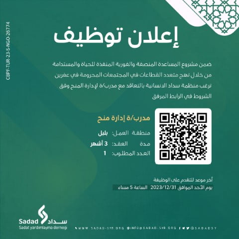 ترغب منظمة سداد الانسانية بالتعاقد مع مدرب/ة في ادارة المنح وفق الشروط في الرابط التالي منطقة العمل :عفرين (بلبل )