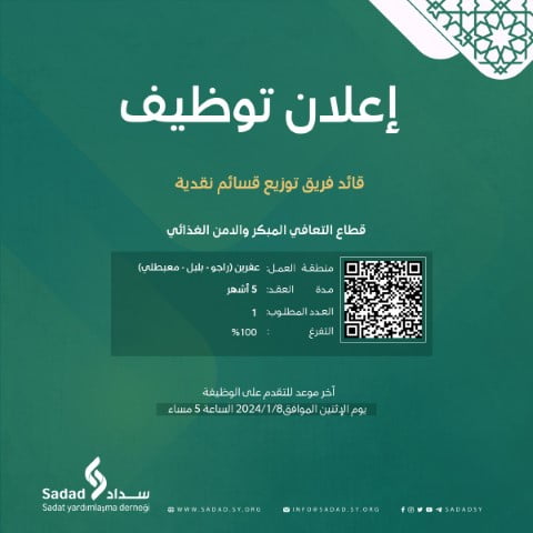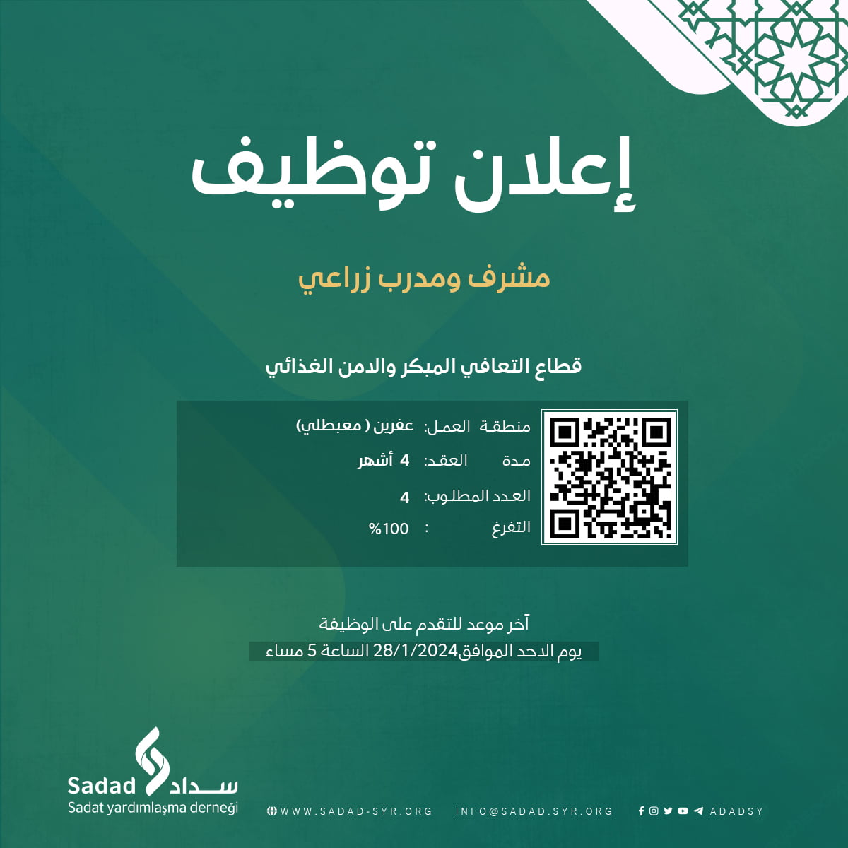 تدعوكم منظمة سداد للتقدم إلى شاغر مشرف ومدرب زراعي ضمن قطاع التعافي المبكر والأمن الغذائي كود الشاغر: HR-FSL, ER-SY-0017-24 منطقة