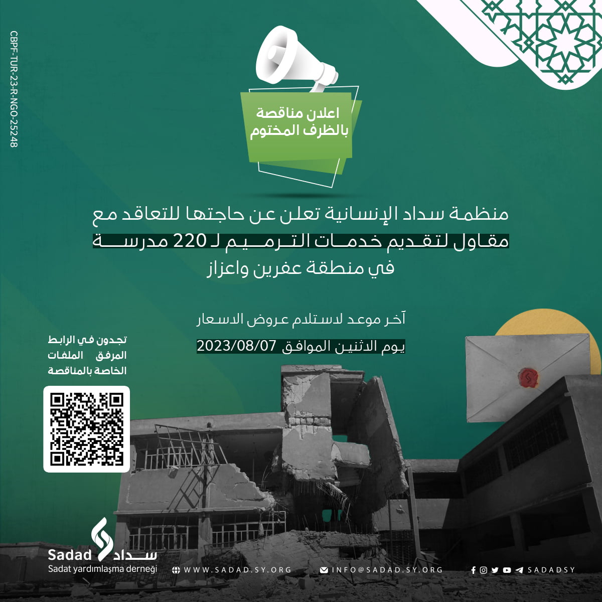 SADAD Humanitarian Organization announces its need to contract with contractors to provide restoration services for 220 schools in Afrin and [...]
